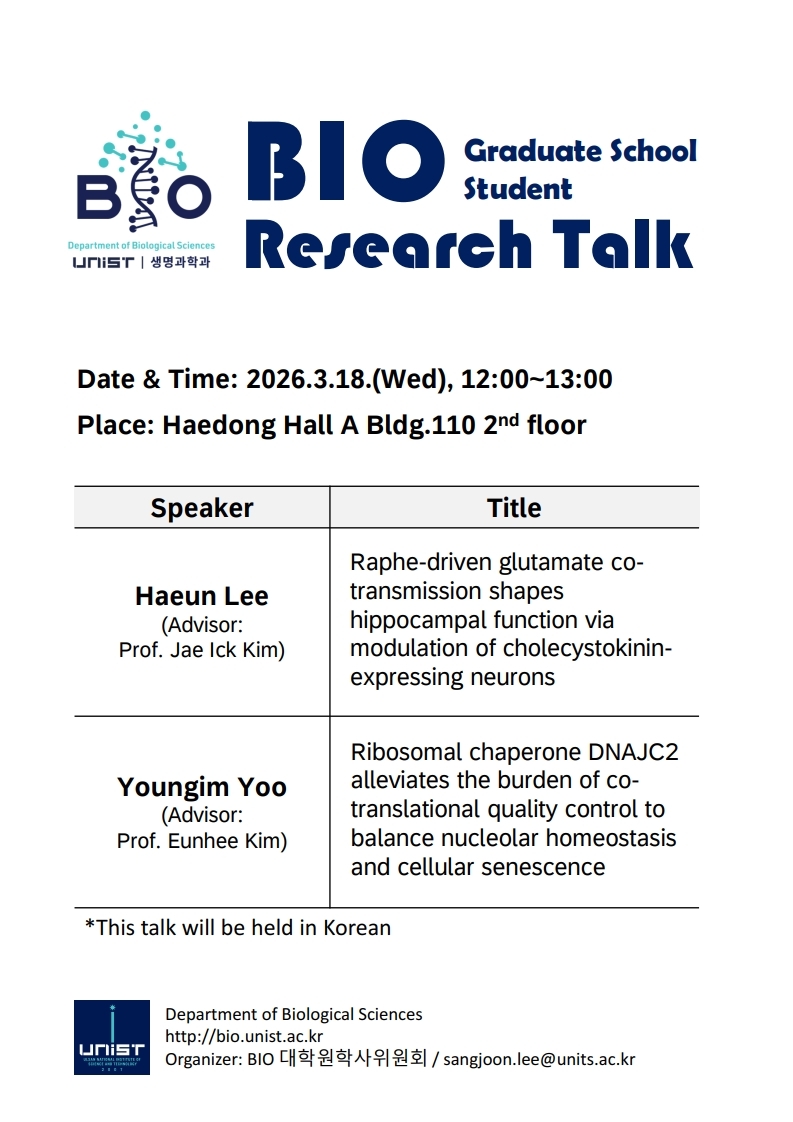 UNIST BIO graduate school student research talk 2026.03.09 구분 Seminar 날짜 2026-03-18 12:00:00 장소 Haedong Hall A, Bldg.110 연사 이하은, 유영임