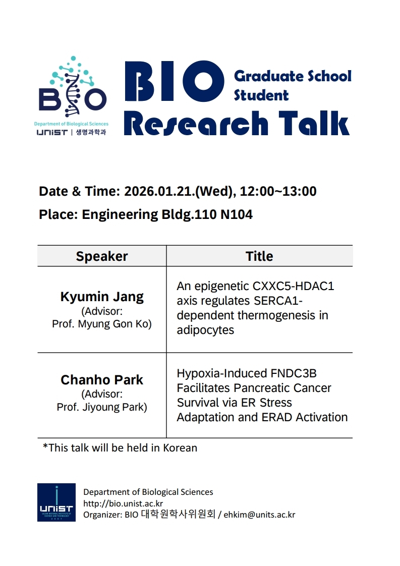 UNIST BIO graduate school student research talk 2026.01.09 구분 Seminar 날짜 2026-01-21 12:00:00 장소 Engineering Bldg.110, N104 연사 장규민, 박찬호