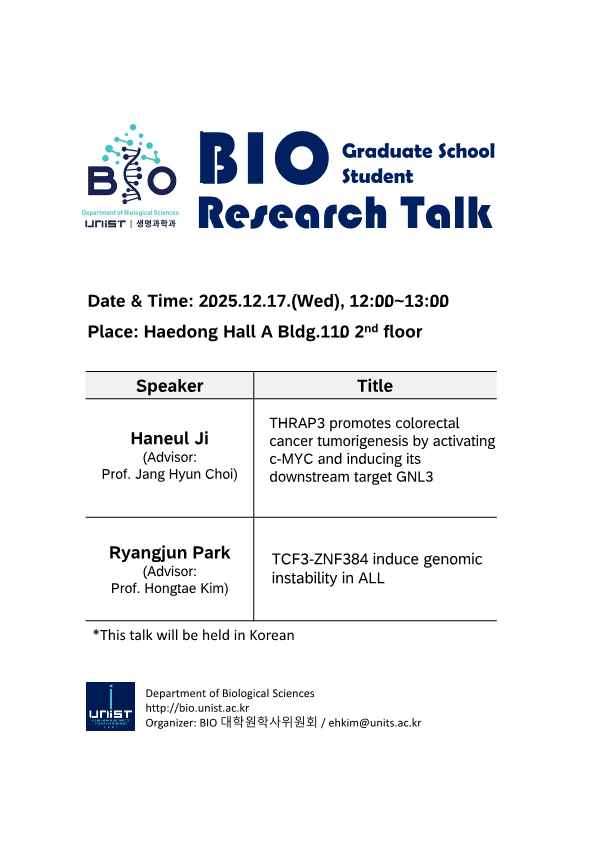 UNIST BIO graduate school student research talk 2025.12.09 구분 Seminar 날짜 2025-12-17 12:00:00 장소 Haedong Hall A, Bldg.110 연사 지하늘, 박량준